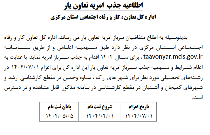 اطلاعیه جذب امریه تعاون یار ۱۱ تیر ۱۴۰۴ | ۱۲:۰۴ کد : ۵۲۷۴۸ اطلاعیه ارسال به دیگران نام شما ایمیل شما ایمیل دریافتکننده ارسال انصراف تعداد بازدید:۱۶۷۵ اطلاعیه جذب امریه تعاون یار